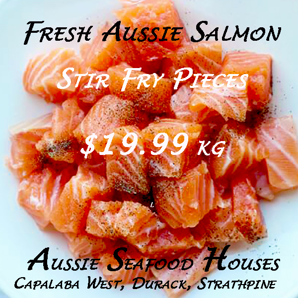 Delicious Australia Salmon from Tasmania, Cubed ready for Stir fries, Kebabs, Bbq Pieces, Risotto, the uses are endless. Ready Now at all 3 Aussie Seafood Houses .. Capalaba West, Durack, Strathpine Stores are Open 7 Days a Week .